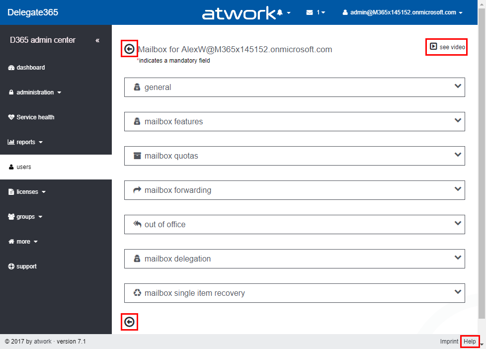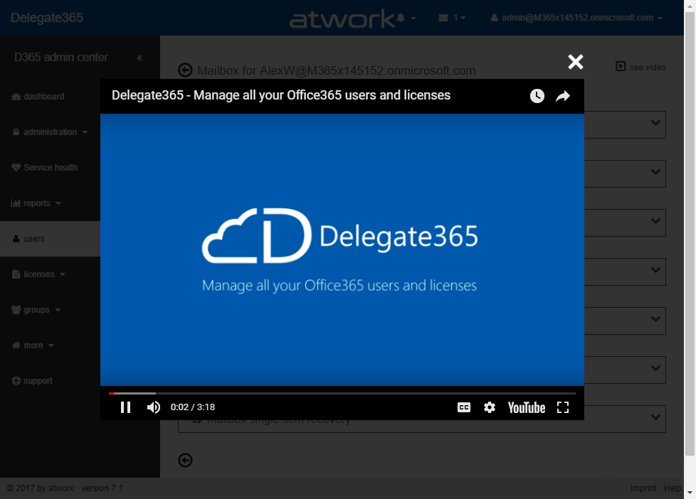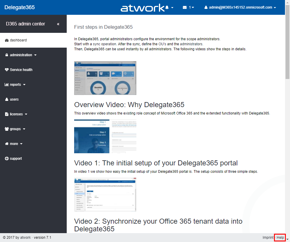 We think this will help administrator to watch the functionality of the current module and to inform about the topic.Help page: The Help link available on the right side in the footer now uses the same concept and shows the initial steps for configuring Delegate365 in short videos.