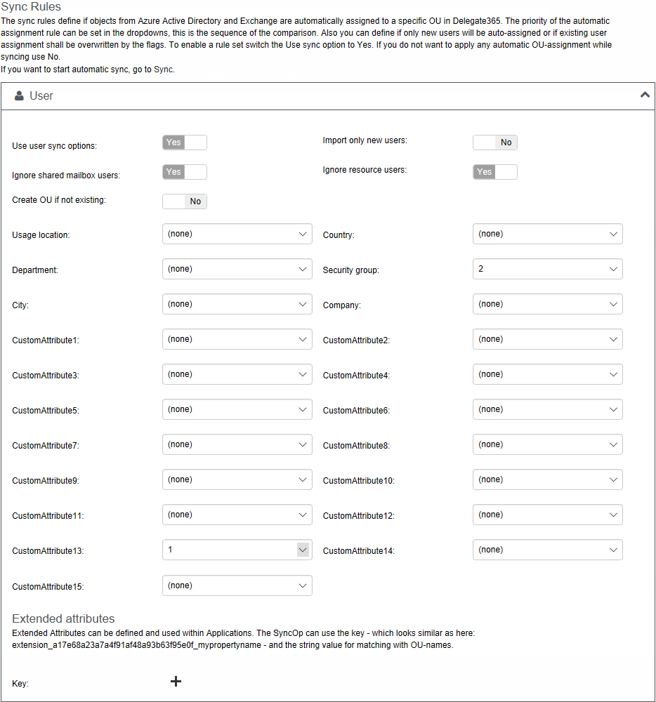 For better clarity, now the admin can add more conditions dynamically as needed. Additionally, each rule can be set (in)active and the SyncOp can apply the rule to all users, sign-in allowed users or sign-in blocked users in the new user interface. Also, the Extended attributes have got an own box with the same options and allow a more customized filtering.