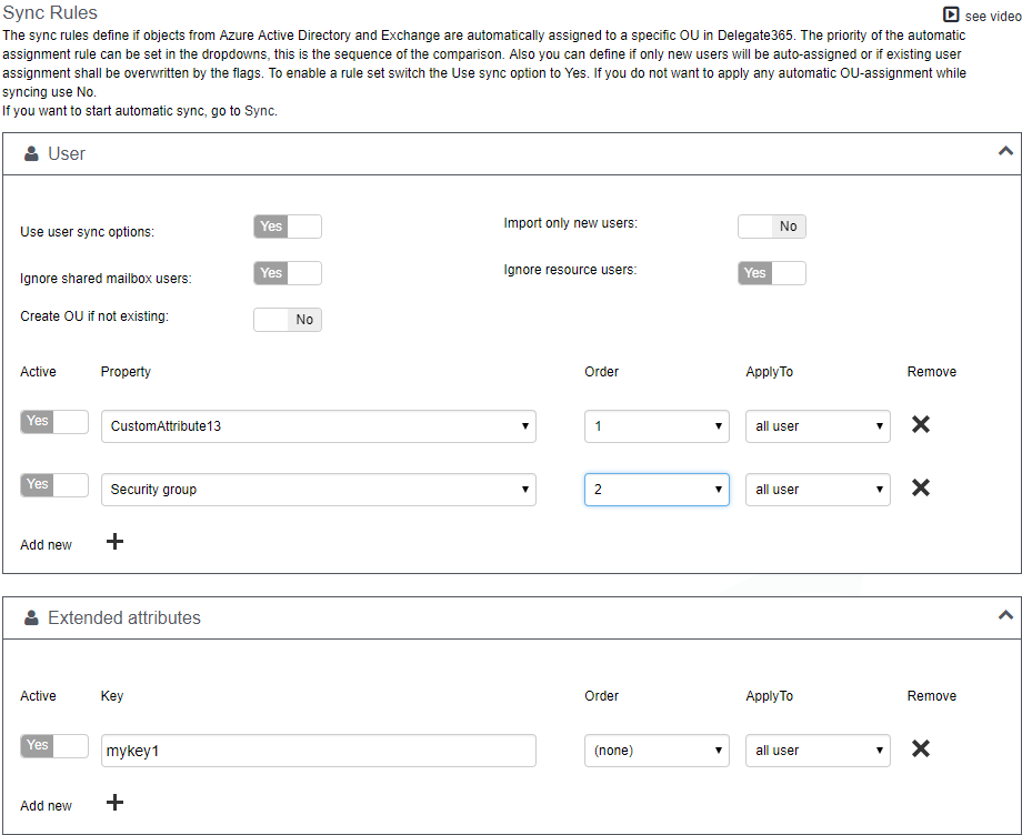 Again, these videos will be updated in near future.Sync-Rules UI standardization: The Sync Rules allow to define conditions for automatic OU assignments and Office 365 license assignments for users and groups in Office 365. We added more features in here, but the basic user’s OU assignment interface did no longer fit to the rest of the conditions. In previous versions, the dropdowns needed to be filled with the priority of the desired rule, where the property name must match any OU name in Delegate365 (as f.e. CustomAttribute13 stores “New York” and there is an OU “New York”, so that the user gets assigned automatically). In contrast, newer conditions (in the boxes below) used dynamical assignments. So, the User box has been changed to the new dynamic conditions interface as well.