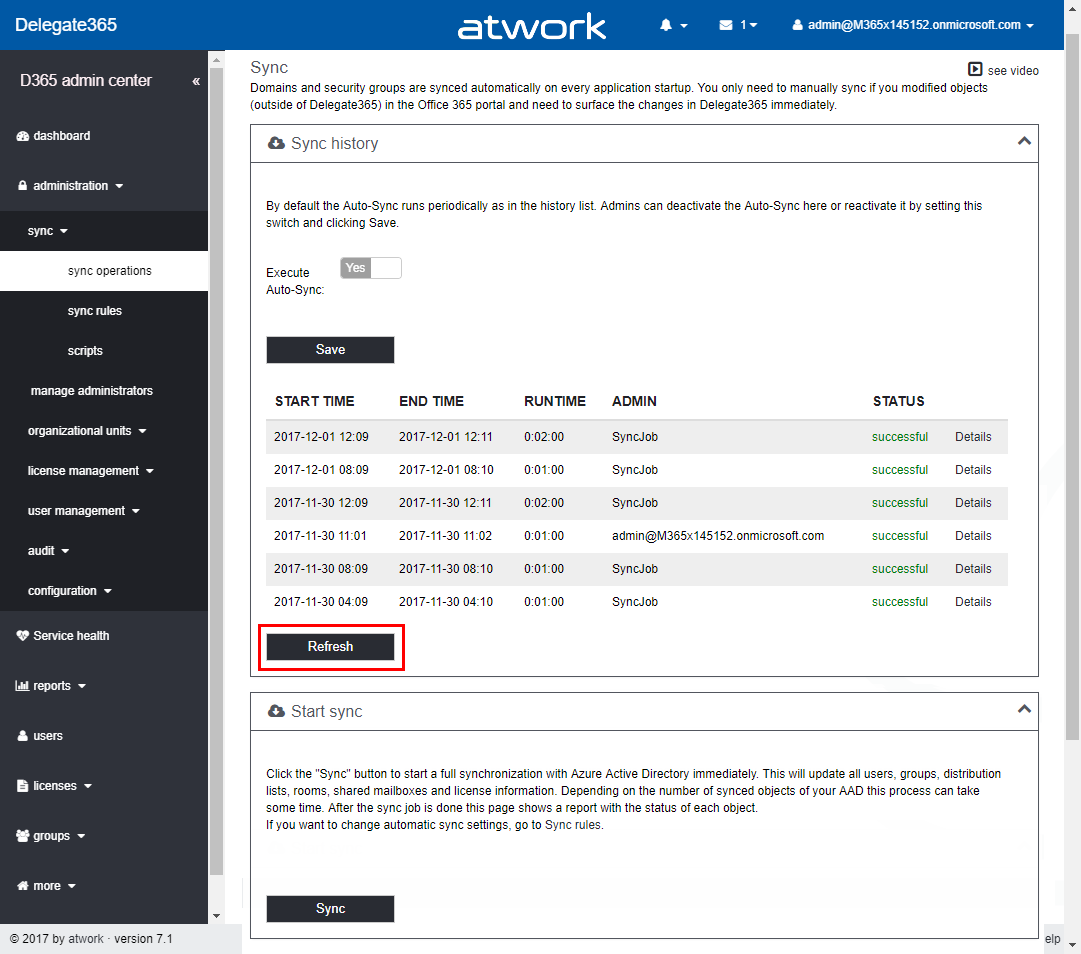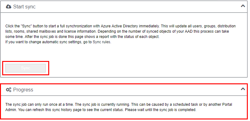 If an admin wants to manually start a new sync while another sync is running, he gets a message informing about that. A new SyncOp cannot be started therefore. To check a currently running SyncOp, there’s a new Refresh button in the sync history box (see above) to see the status if needed. In such a case, pls. wait until the previous SyncOp is finished and then try to restart.