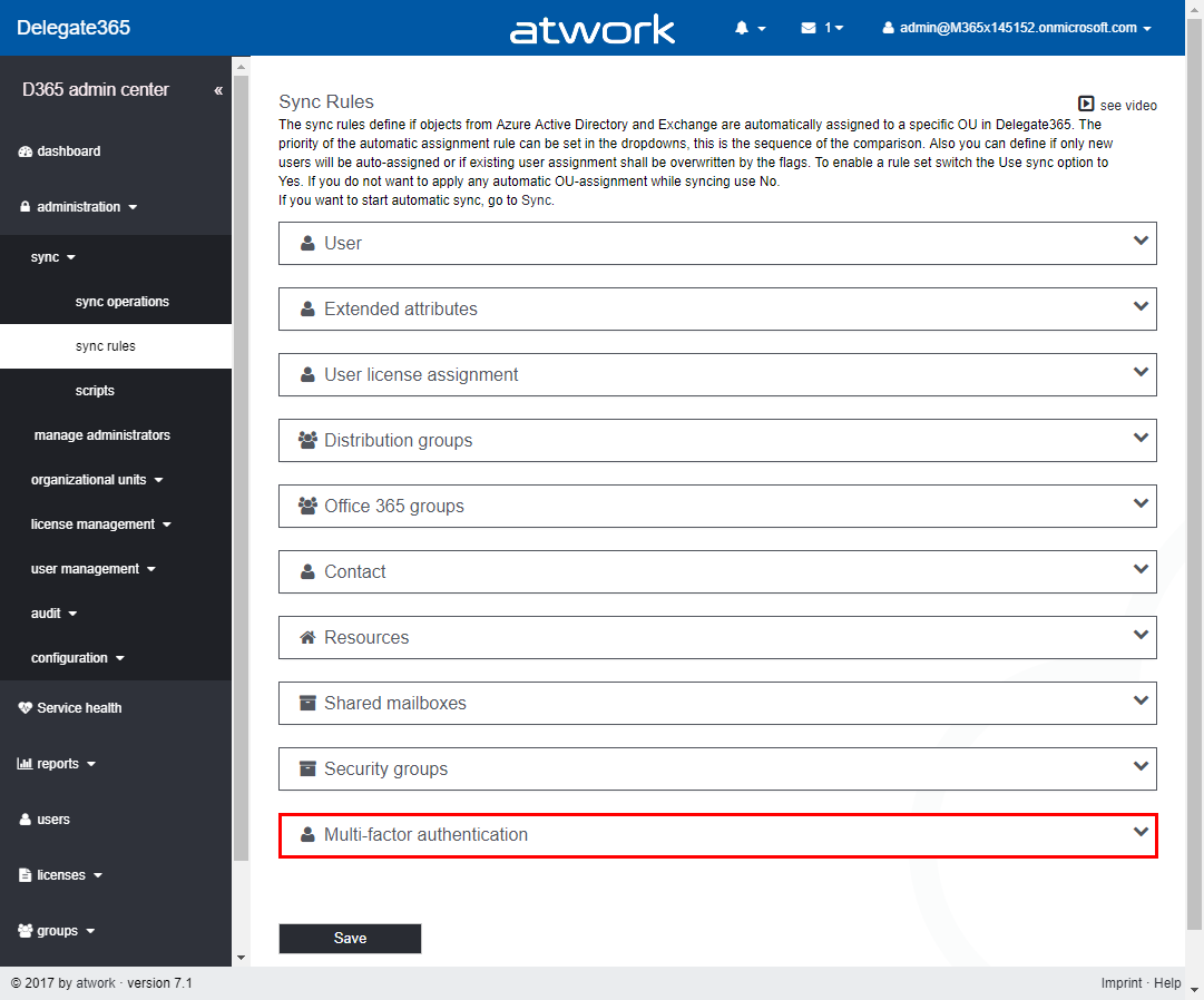 The sync now checks the heartbeats if another SyncOp is running or died during any process (we are working with the cloud…). A new SyncOp can be started manually after a previous sync is finished, or after 15 minutes if a timeout occurred. Usually, if a SyncOp did not fully complete for any reason, simply wait (or start a SyncOp manually) for the next run to accomplish all tasks.Automation for user’s MFA status: Version 7.1 brings a new feature in the administration / sync / sync rules: A new box for setting Multi-factor authentication for users controlled by a group membership.