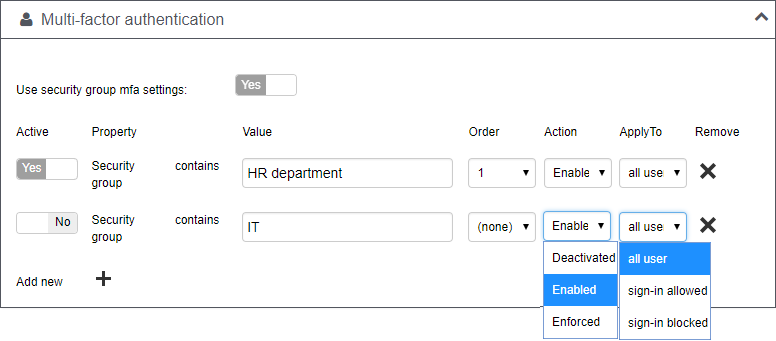 In the MFA box, admins can define rules in a similar way as in the rules above: By adding a condition if a user is member of a specific security group (or email enabled security group), the MFA status can be set for all users, sign-in allowed users or* sign-in blocked* users. The MFA status can be Deactivated, Enabled or Enforced.