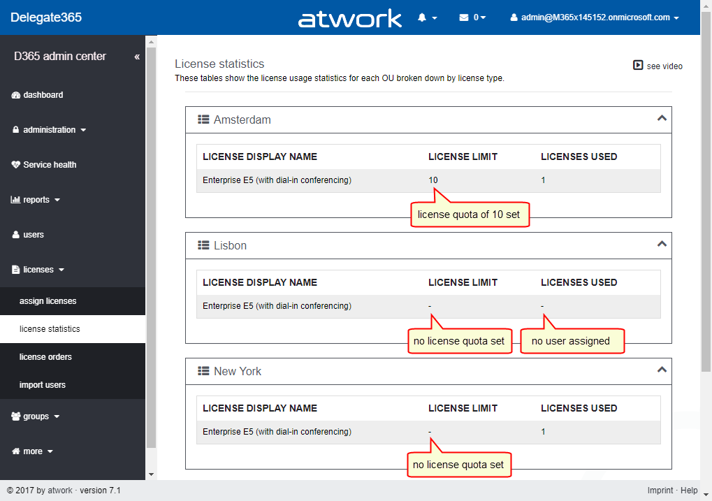 License statistics: To distinguish between no license limits and licenses quotas, the *licenses / licenses statistics *module now shows a dash “-” if no quota is defined. Otherwise, the defined number of the quota is shown. The same goes for the assigned users.