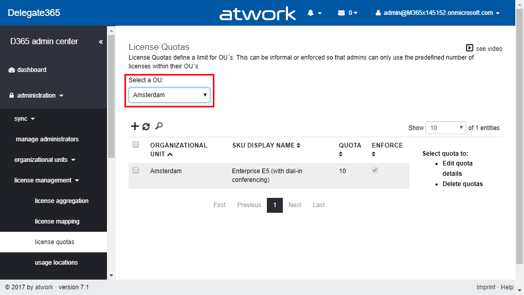 License quotas filter: A new filter allows to show just rules of a specific OU or all OU’s. By default, the filter is set to Any OU and all quotas are shown. The screenshot shows an example by filtering only the rules for OU Amsterdam.