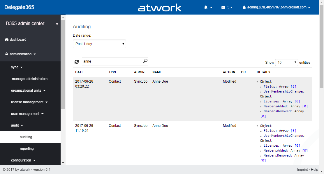 Important: The audit logs can grow very fast since all actions of all administrators and of the sync operations are logged. Depending on the number of objects that were changed, there can be a log of ten thousands of lines at each sync. Delegate365 provides various methods for accessing that data and for handling large amounts of data.