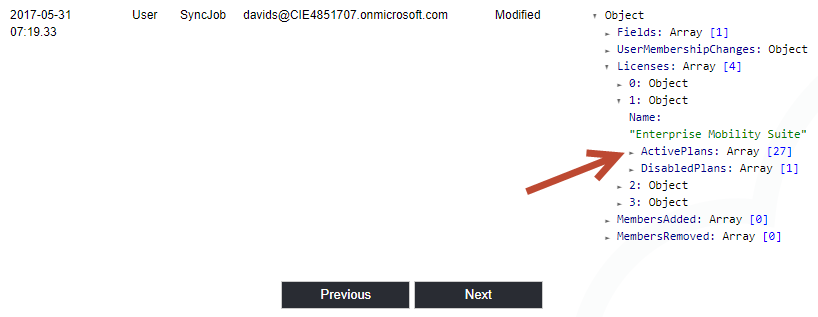 Since the data is logged in a variable data format, the admin can navigate through the details by opening the tree objects as shown here. For example, this user has been changed by the SyncOp automatically and some licenses have been added, so that there are now 27 active plans assigned .