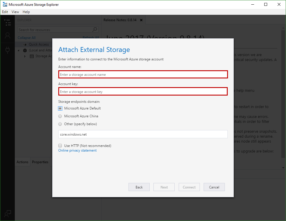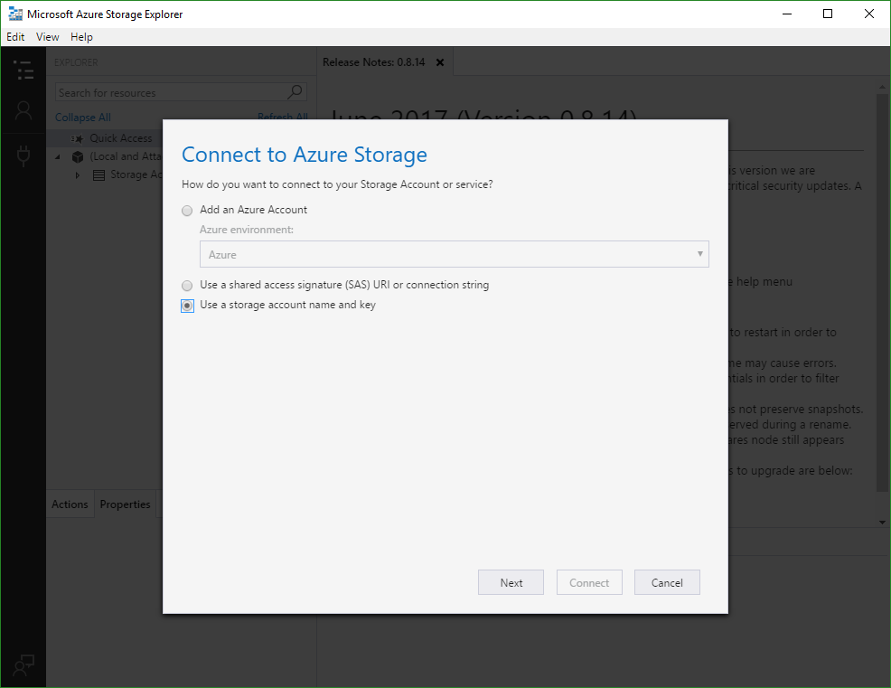 After starting, select “Use a storage account name and key” to connect and click Next.