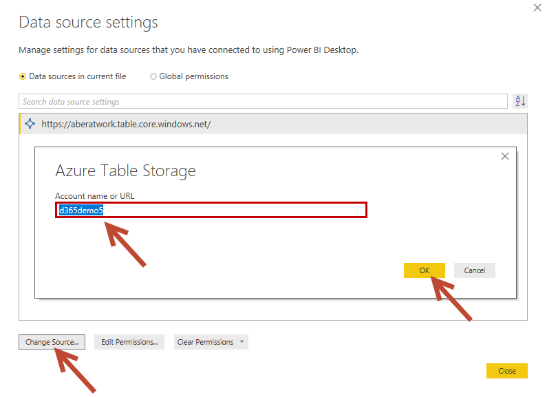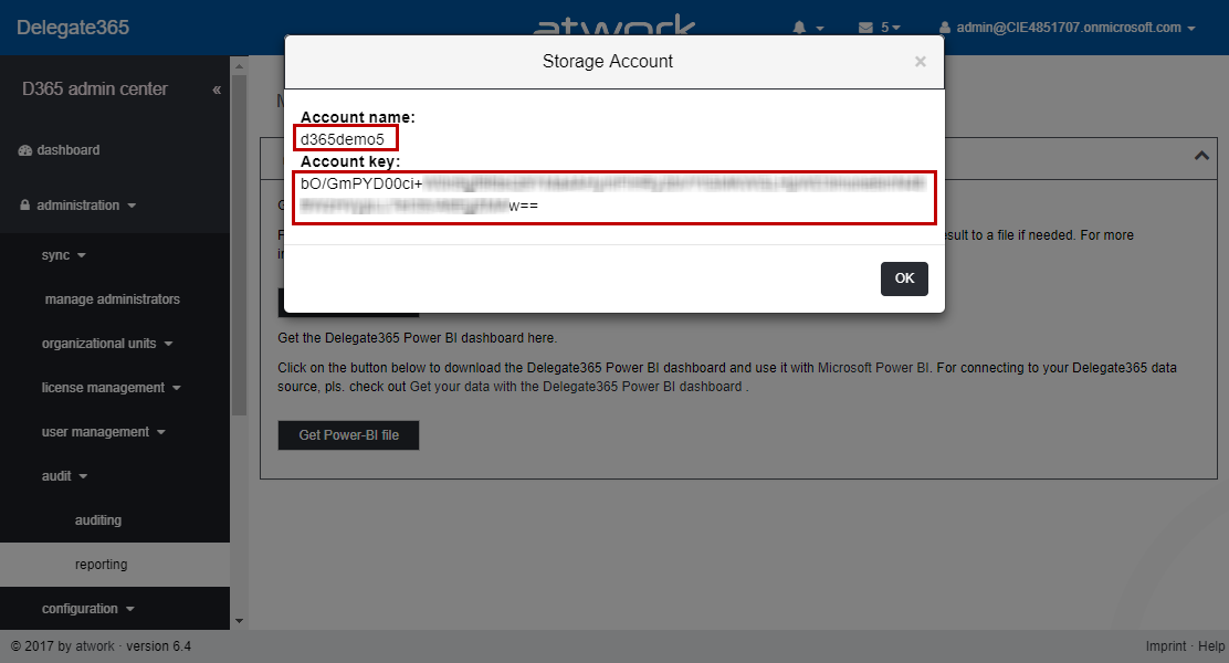 You need to get the access Delegate365 storage account settings as described in (2). Now copy the Azure account name (in our sample “d365demo5”) into the Account name or URL field. Confirm with “Ok”.