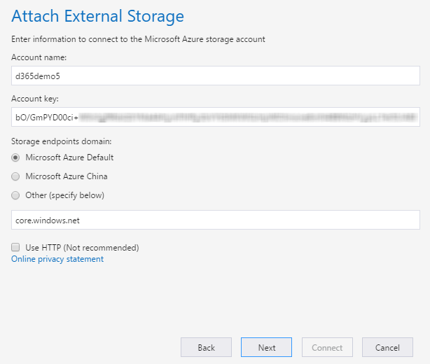 Now we need to enter the Account name and Account key. Leave the other settings as defaults (and as shown here).