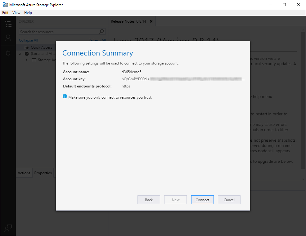 Copy both keys (Account name and Account key) into the Microsoft Storage Explorer form and click Next.