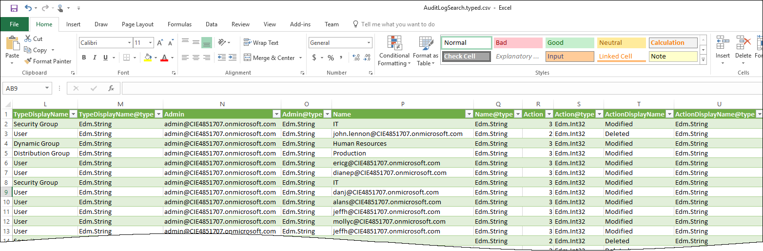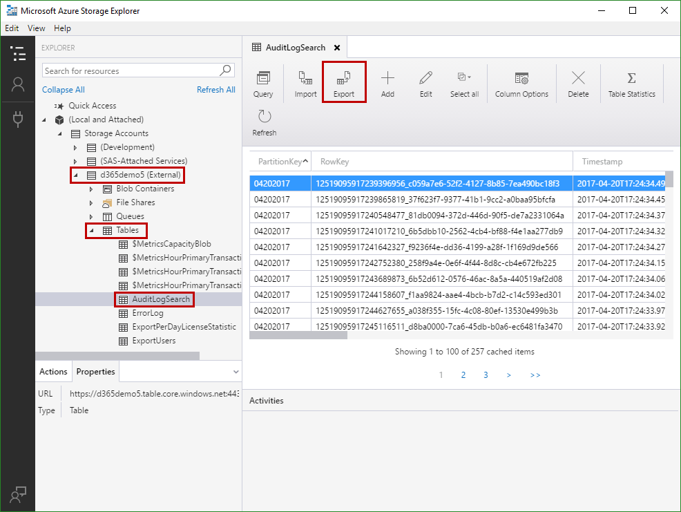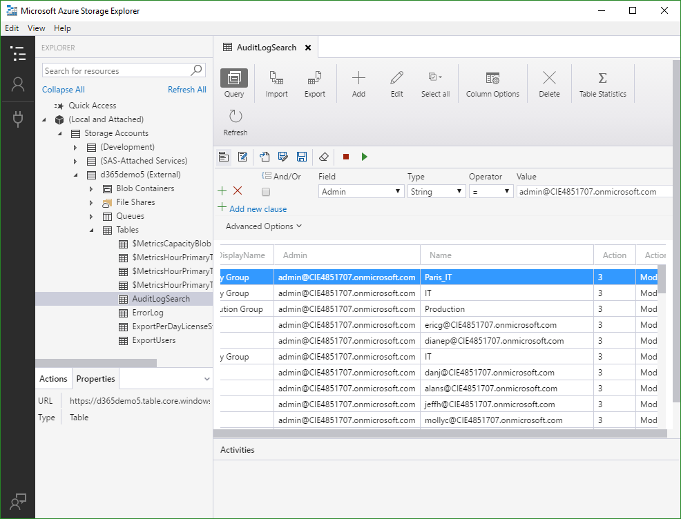Now you should be connected to the Delegate365 storage account. Navigate to your storage account name (d365demo5 in this sample) / Tables / AuditLogSearch. In here you can access all the log data.