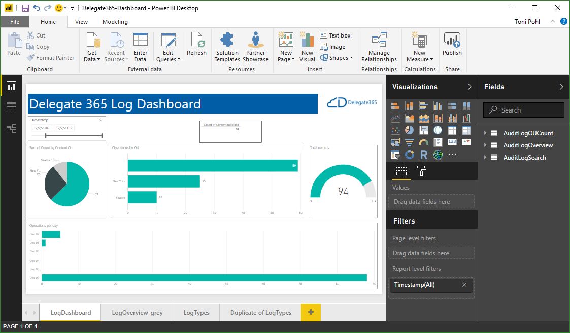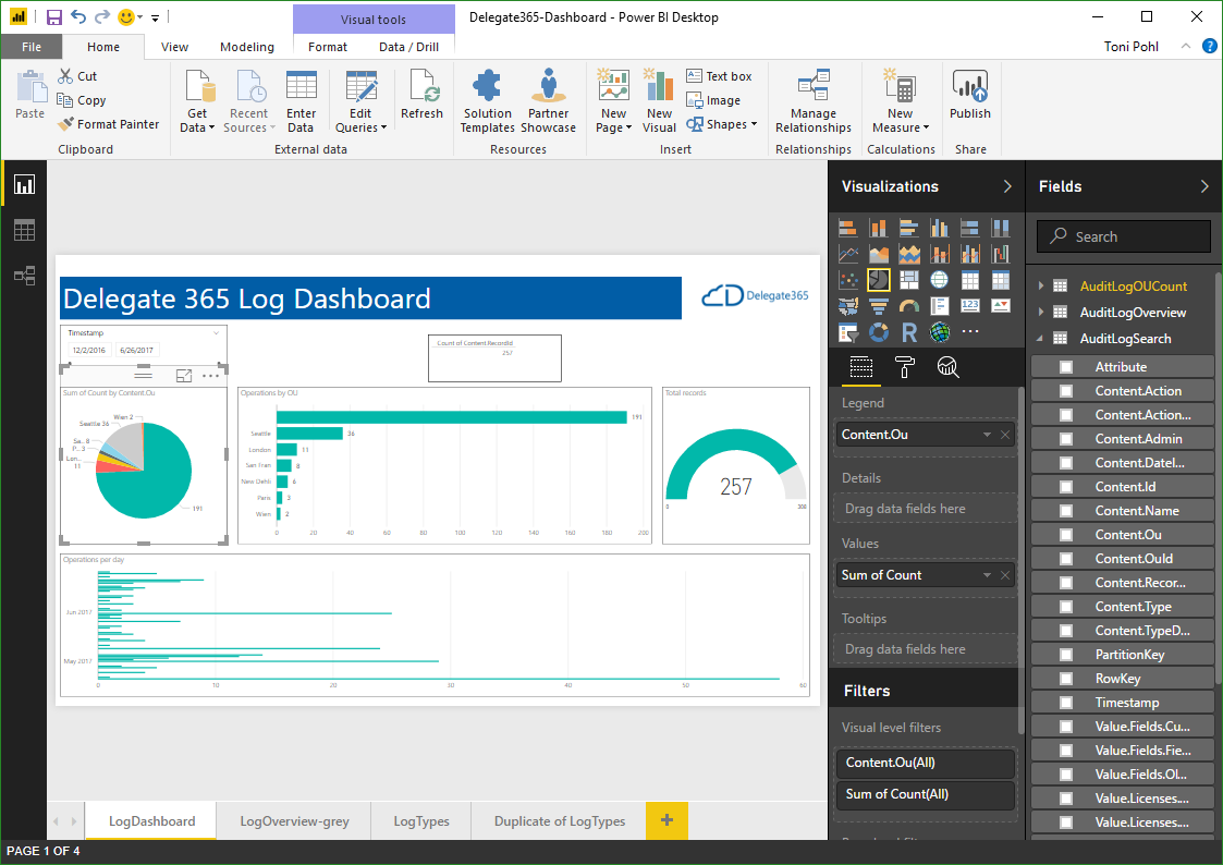 Feel free to modify your dashboards with the data provided by Delegate365 Audit Logs (and don’t forget to save your dashboard with the current data).