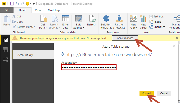 Then, Power BI Desktop will ask you for the Account key. Paste the account key (in our sample “bO/GmPYD00ci+….”) from the Delegate365 settings into that field and click “Connect”.