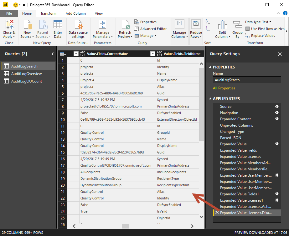 In the Delegate365 Power BI data source, all (possible) data is already transformed from JSON to extra data fields. This allows to easily access all kind of data in the dashboard editor. The following screenshot shows the applied steps for the data source to extract all data from JSON format to fields.