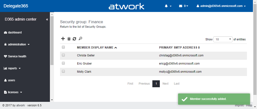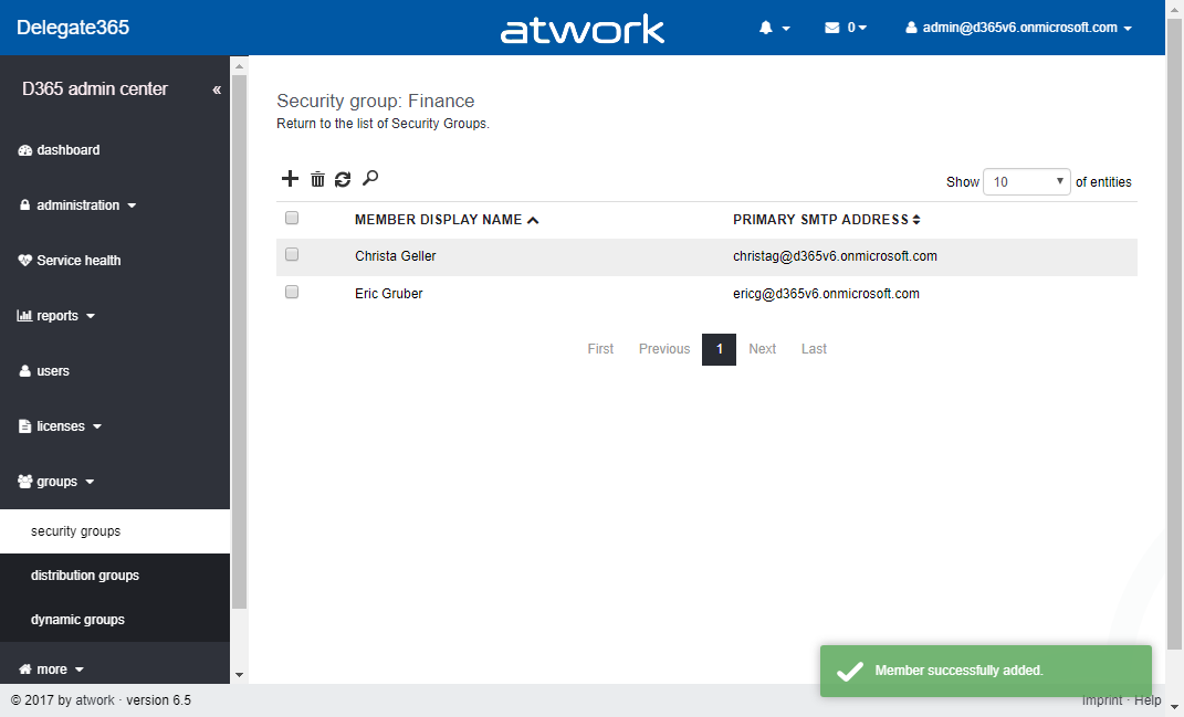 Many organizations work with security groups to simplify their user management. In my scenario, I created some security groups within Delegate365 and added some users as members. Security group Finance has *Alan *and Christa as members.