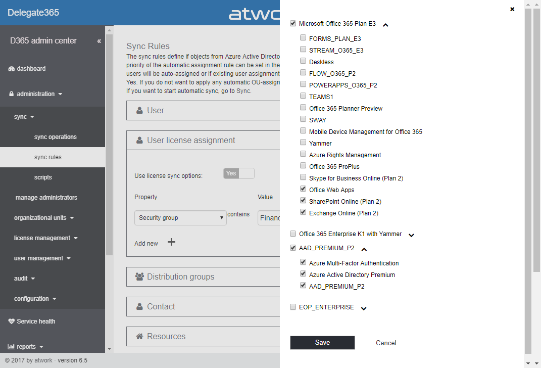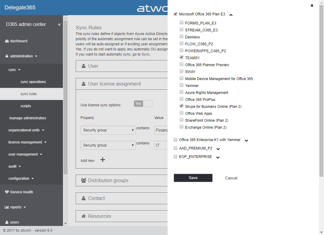 The License Assignment is available since version 6.4. For details, pls. see the description here. This new feature allows to assign Office 365 licenses in a very custom way to users and runs at each Delegate365 synchronization operation, So, whenever a SyncOp runs, Delegate365 checks the sync rules and assigns licenses as specified. So let’s see how this works step-by-step as follows.