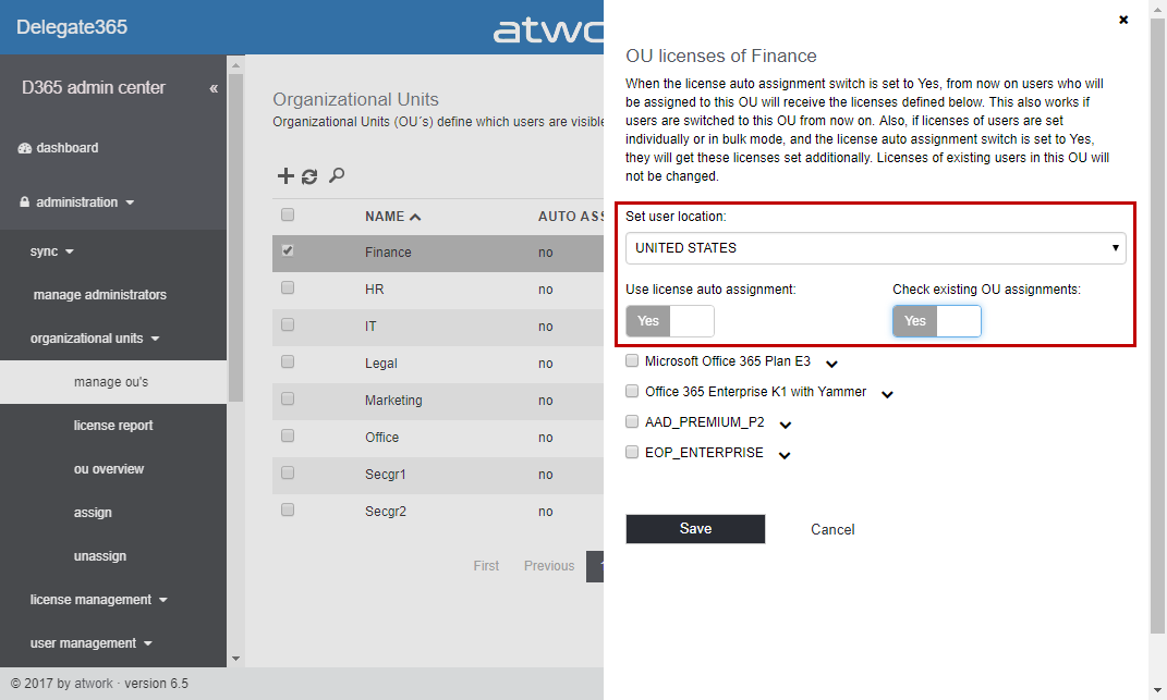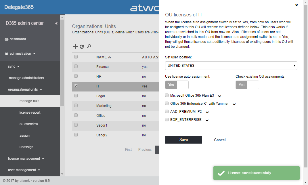 Office 365 requires to have a UsageLocation set for each user who shall get any license. As administrator you need to take care of that fact. It can be the case, that some users have a UsageLocation set and others not. With Delegate365 this can be set in the OU Auto License Assignments if needed, in module *administration / organizational units / manage ou’s *(see Delegate365 changelog version 6.5-Service health, logging and more “Assign OU Licenses and UsageLocation”).