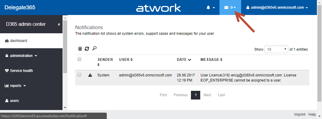 Some licenses sets are not possible since they are not permitted by Office 365. For example, the message “User Licence(318) ericg@d365v6.onmicrosoft.com: License EOP_ENTERPRISE cannot be assigned to a user.” informs that that license could not be assigned. Microsoft is continuously adding licenses and plans and combinations and such messages (as for example, double license plans in different SKU’s) are possible. The notification center informs about such issues.