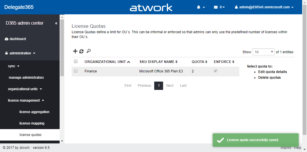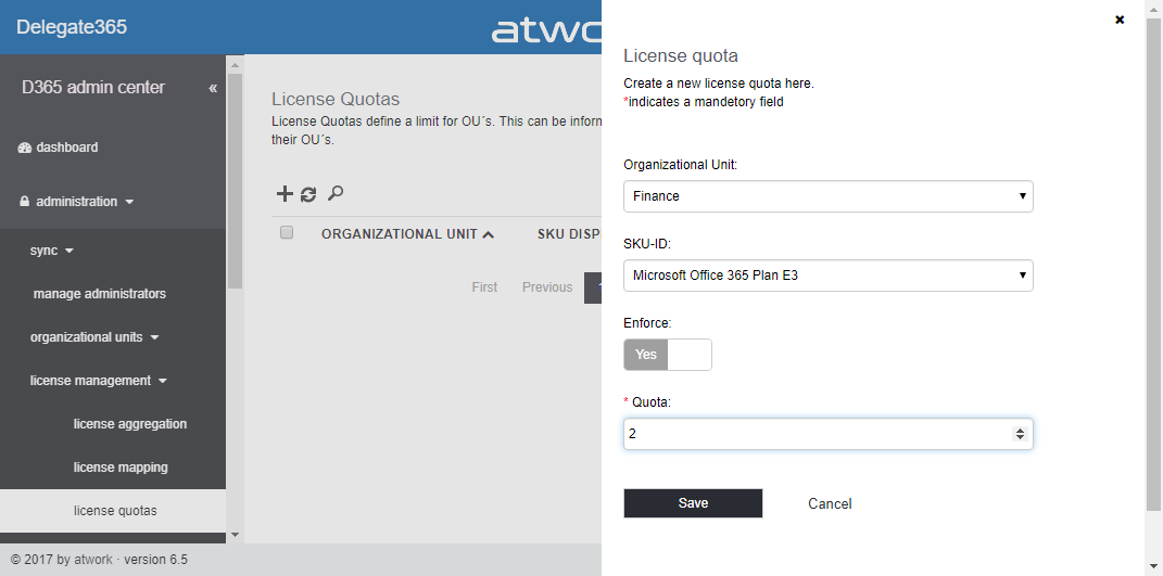 - In Delegate365, there is a license quota defined for an OU and the limit is exceeded.