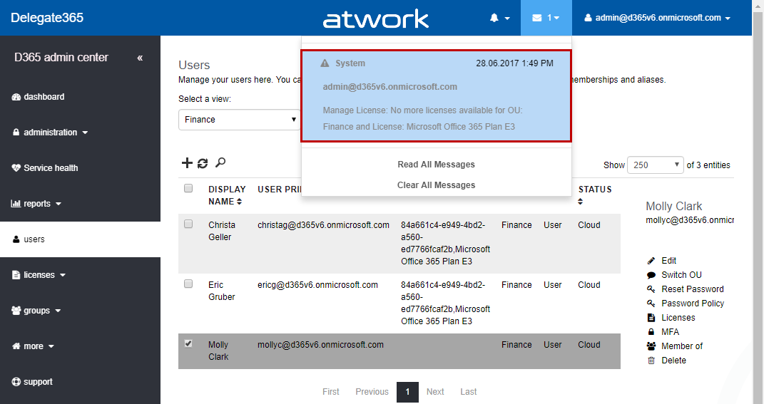 If we check the notifications, we see the reason: “No more licenses available for OU: Finance and Licenses: Microsoft Office 365 Plans E3”. The license could not be assigned because of the license quota of 2.