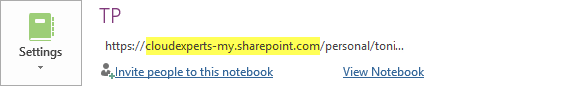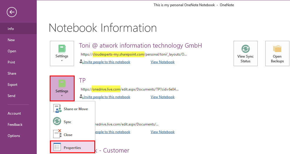 Go to the File menu. Here’s a list of your connected notebook with the storage path. you can clearly see what’s stored where – in my sample I have a notebook stored in my Intranet (“Toni @ atwork…”) and one stored in my OD (“TP”). Open the" Setting"s and go to “Properties” as here: