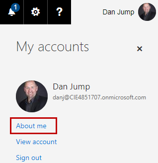 Office 365 users can update (some of) their user properties in the web portal at portal.office.com by opening the user menu in the top right corner. Here, select About me.