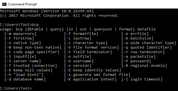 Then, the bcp utility shows it’s parameters. Basically, it knows how to import or to extract data, to query data an dot use a format file with data.