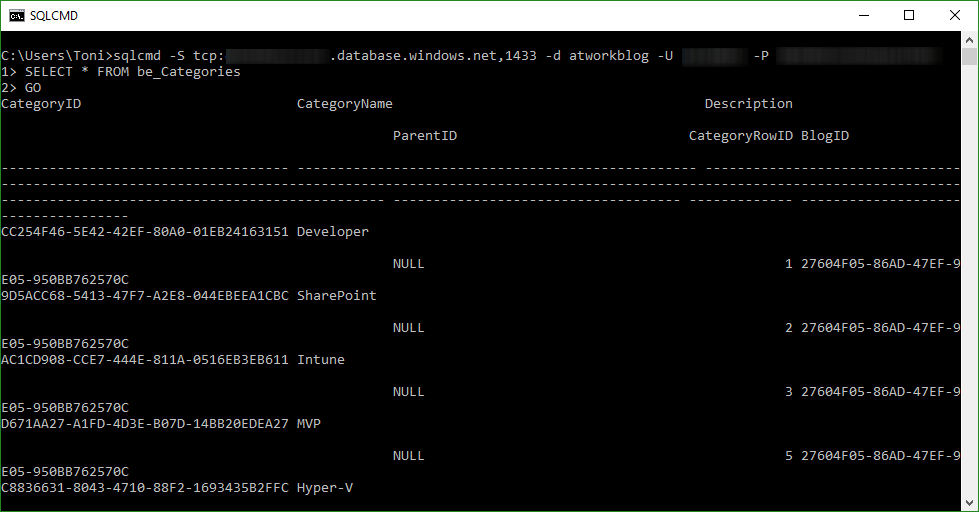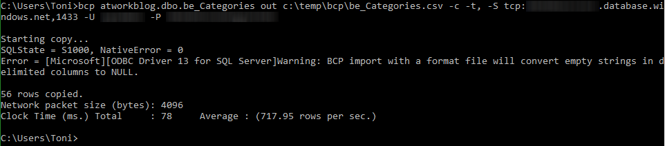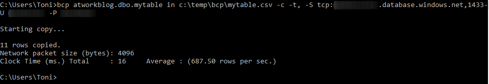 I have included –c for not prompting for each field data type and –t, for using a comma as separator (there is not space between -t and the comma). With Azure, the servername is always the full path to the database.windows.net domain. If any database object has spaces or a dot included in its name, use [ ], as for example: bcp [atwork.at].dbo.myTable …