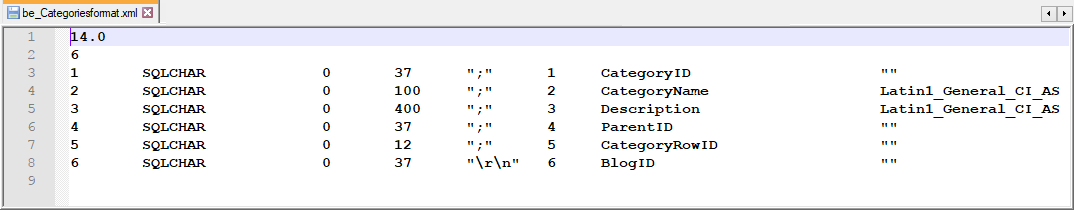 bcp atworkblog.dbo.be_Categories format nul -c –t; -f c:\temp\be_Categoriesformat.xml –S …
