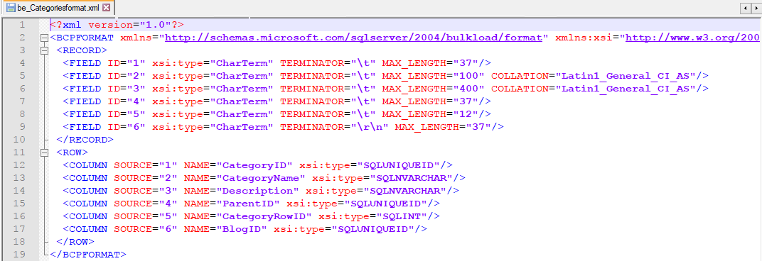 bcp atworkblog.dbo.be_Categories format nul -c –x -f c:\temp\be_Categoriesformat.xml –S …
