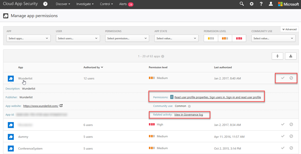 App Permissions zeigt an welche Applikationen Zugriff auf Ihren office 365 erhalten haben. Zusätzlich sehen Sie noch eine damit verbundene Risikobewertung. Sie sehen, wieviele Benutzer diese Apps verwenden und welche Daten die App benutzen darf. Ein Beispiel könnte eine Kalenderapp sein, die Sie in office 365 berechtigen. Damit darf diese App Ihren Kalender einsehen, möglicherweise auf Ihr Profil zugreifen und in Ihrem Namen posten. Mit App Permissions können Sie das überprüfen und Apps sogar proaktiv – für alle Benutzer – sperren.
