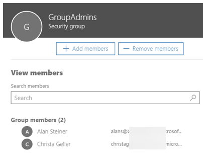 So, in the Office 36 portal we add Alan and Christa as members to Security Group “GroupAdmins”.