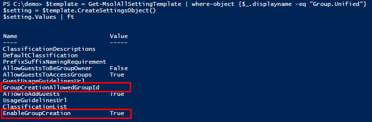 $template = Get-MsolAllSettingTemplate | where-object {$_.displayname -eq "Group.Unified"}