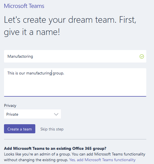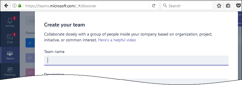 Here it depends, if there are already teams existing or not. If teams are existing, https://teams.microsoft.com/_#/discover is loaded with a list of the teams. If not, a form follows where we need to name the new Teams site and set the privacy level.