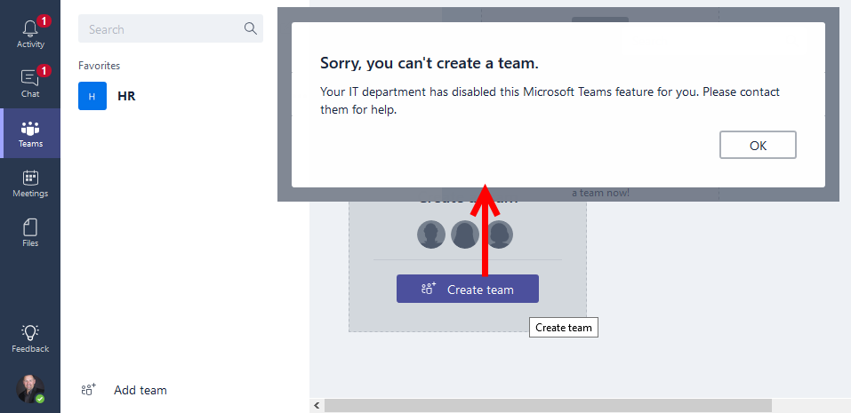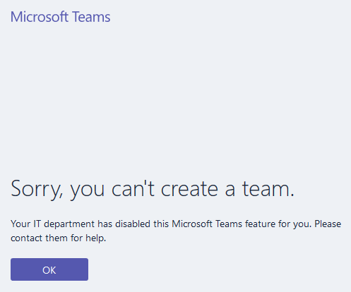 The team site says: “Sorry, you can’t create a team. Your IT department has disabled this Microsoft Teams feature for you. Please contact them for help.”