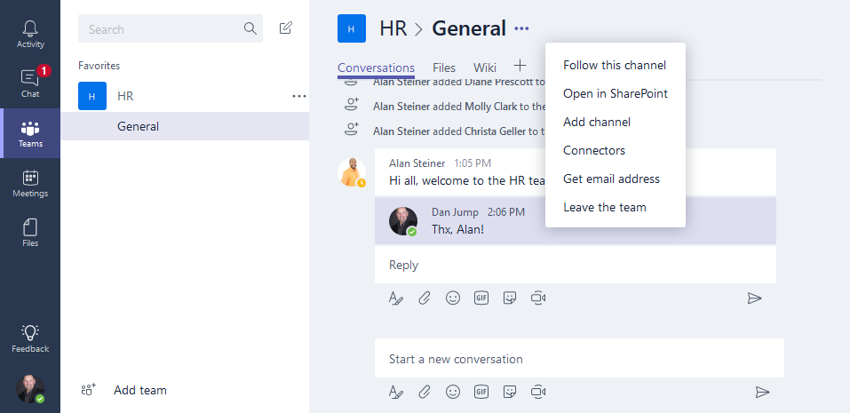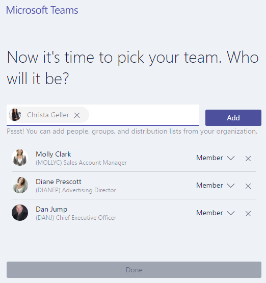…and we can pick members of the “HR” team, as for example, Dan and other users in the Office 365 tenant. Users can be “member” or “owner” of a Microsoft team which can be selected here optionally. by default the role is “member” in a Microsoft team. It’s a good hint that you can add people, groups, and distribution lists from your organization.