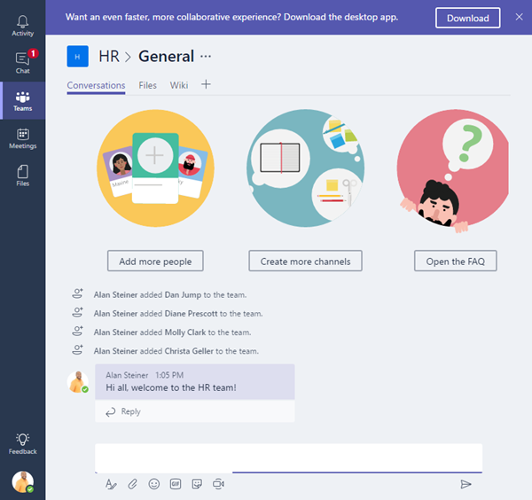 If a user is member of a Microsoft team, the first experience shows the membership. In our sample, we open https://teams.microsoft.com as user Molly (mollyc).