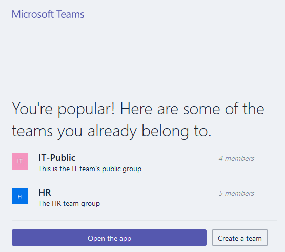 In here, we get the same experience if we click “Create a team” as in the beginning above, if no group is existing. Otherwise, the Microsoft teams “app” is loaded, showing the Microsoft teams-portal with all Microsoft teams where the user is entitled.