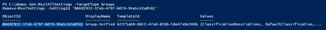 Remove-MsolSettings -SettingId '86692932-37e6-4797-b076-94a5c42a0561'