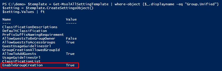 To check the “EnableGroupCreation” property, use the query as in the beginning: