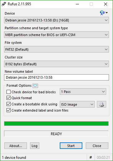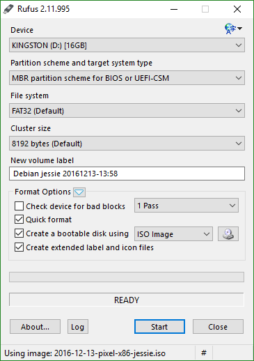 In Rufus, I selected the downloaded ISO file 2016-12-13-pixel-x86-jessie.iso in the “Create a bootable disk using…” file picker: