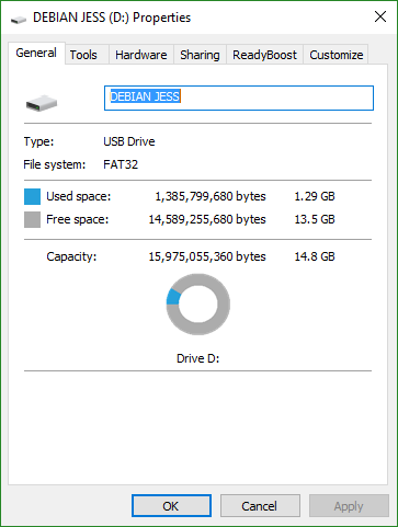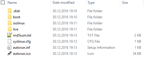 The file system on the USB drive then looks as here: About 1,29 GB are used on a FAT32 partition.