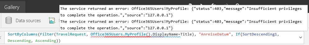 “The service returned an error: Office365Users!MyProfile: {“status”:402,“message”:Insufficient privileges to complete the operation.”,“source”:“127.0.0.1”}" appeared as error in each expression where that data source was used. So, after trying this for some time, I googled.