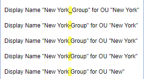 Take care when using a normal space character as separator: Then, the OU name can only be one word, for example: “New York Group” would result in an OU “New” and the group name is “York Group”. As workaround, the OU-name could be named with a hyphen “New-York” or similar.