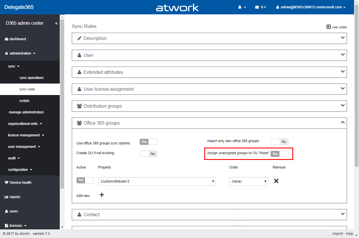This switch simplifies the OU assignment, so that all Office 365 objects are automatically visible in Delegate365, even if they don’t match any sync rules. Later, Delegate365 Admins can decide what to do with these objects and manually assign them to another OU or set any properties or define any rules.
