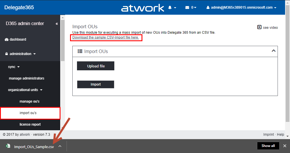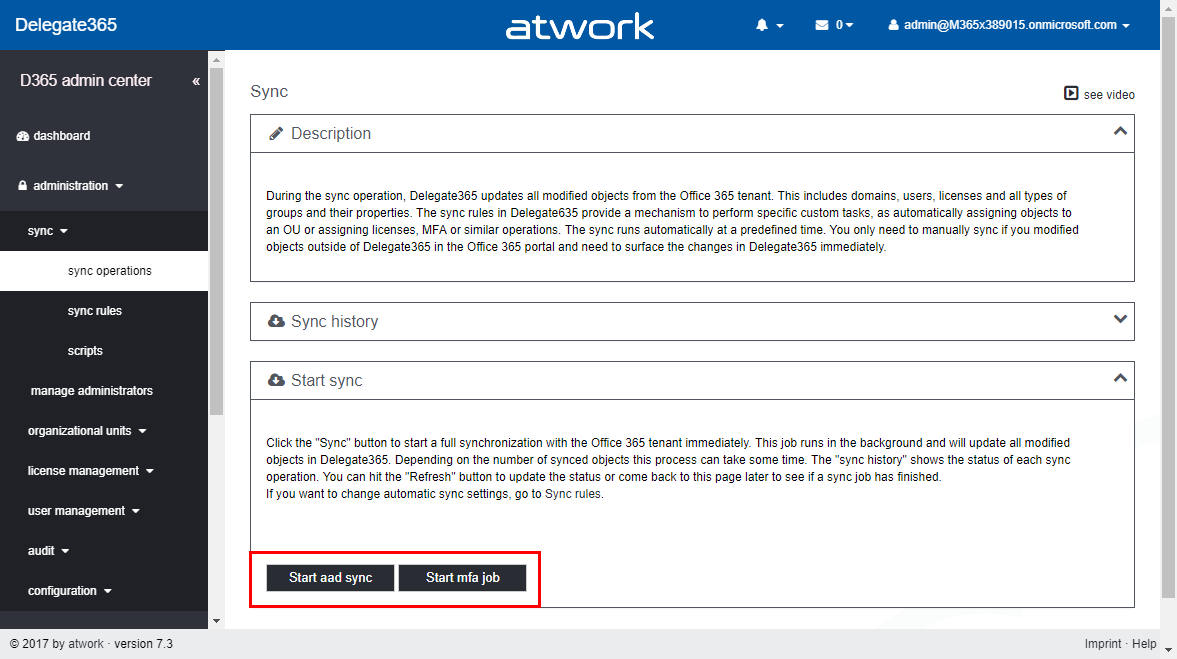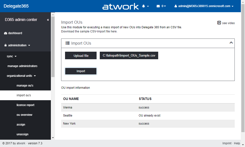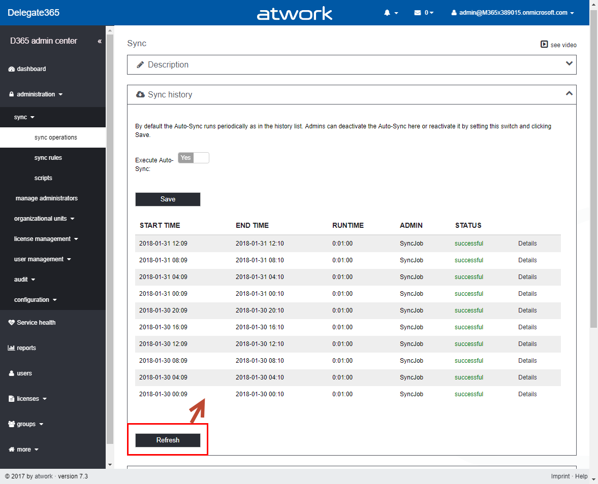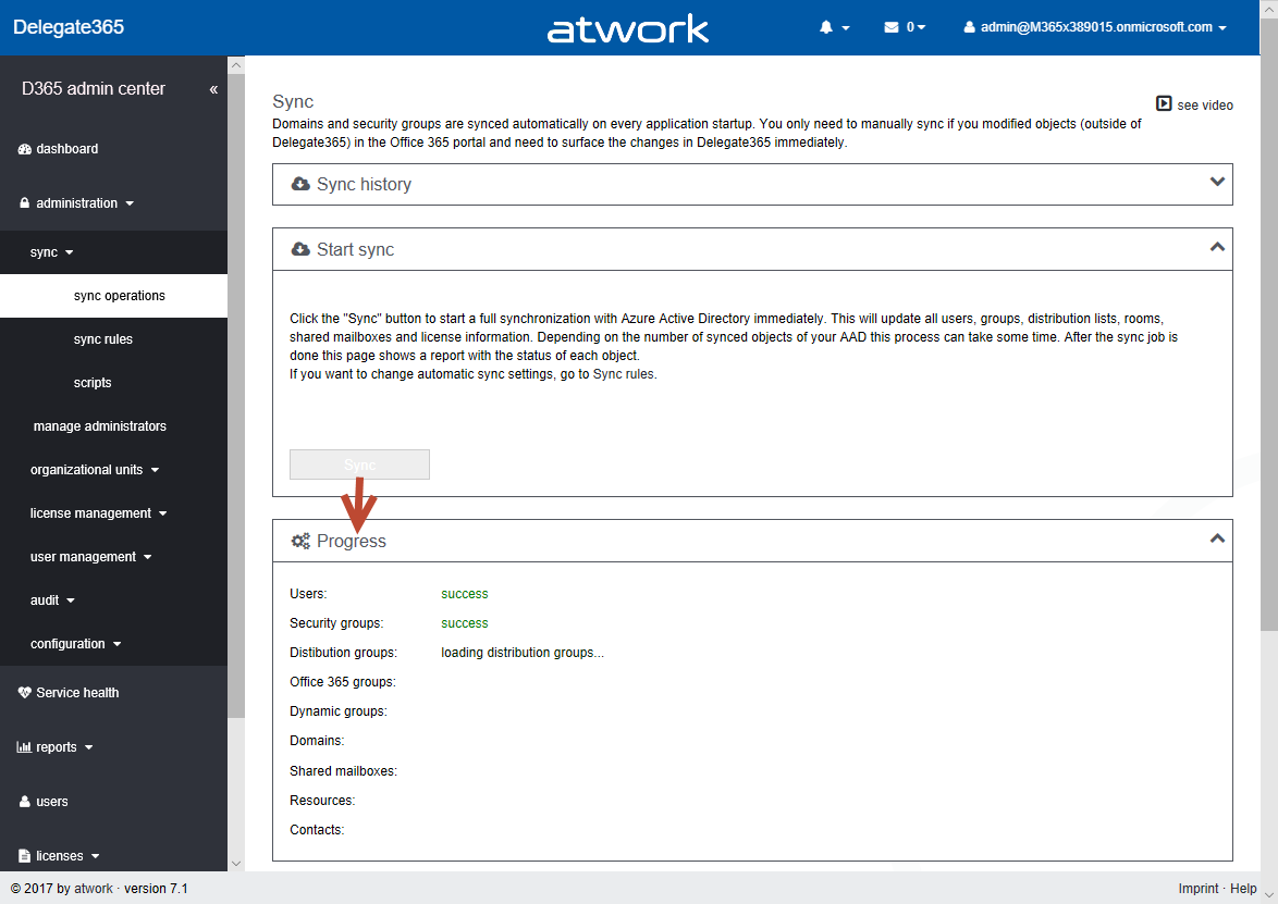 If the import was successful, the list below shows the status. If an OU was already existing, a status “OU already exists” is shown, otherwise “success”. This feature is helpful if an organization exports their extensive OU-list from their local Active Directory and wants to use these names as OU’s in Delegate365 easily. As usual, the OU’s can be renamed in manage OU’s. Don’t forget to assign admins to the new OU’s afterwards in manage administrators.Sync operations: new behavior: Running a manual sync is used very rarely and can take some time, depending on the tenant size and operations The following screenshot shows the old behavior (up to version 7.1). When the Sync button was clicked, the Progress box below showed the sync-progress at the bottom of the sync operations page.
