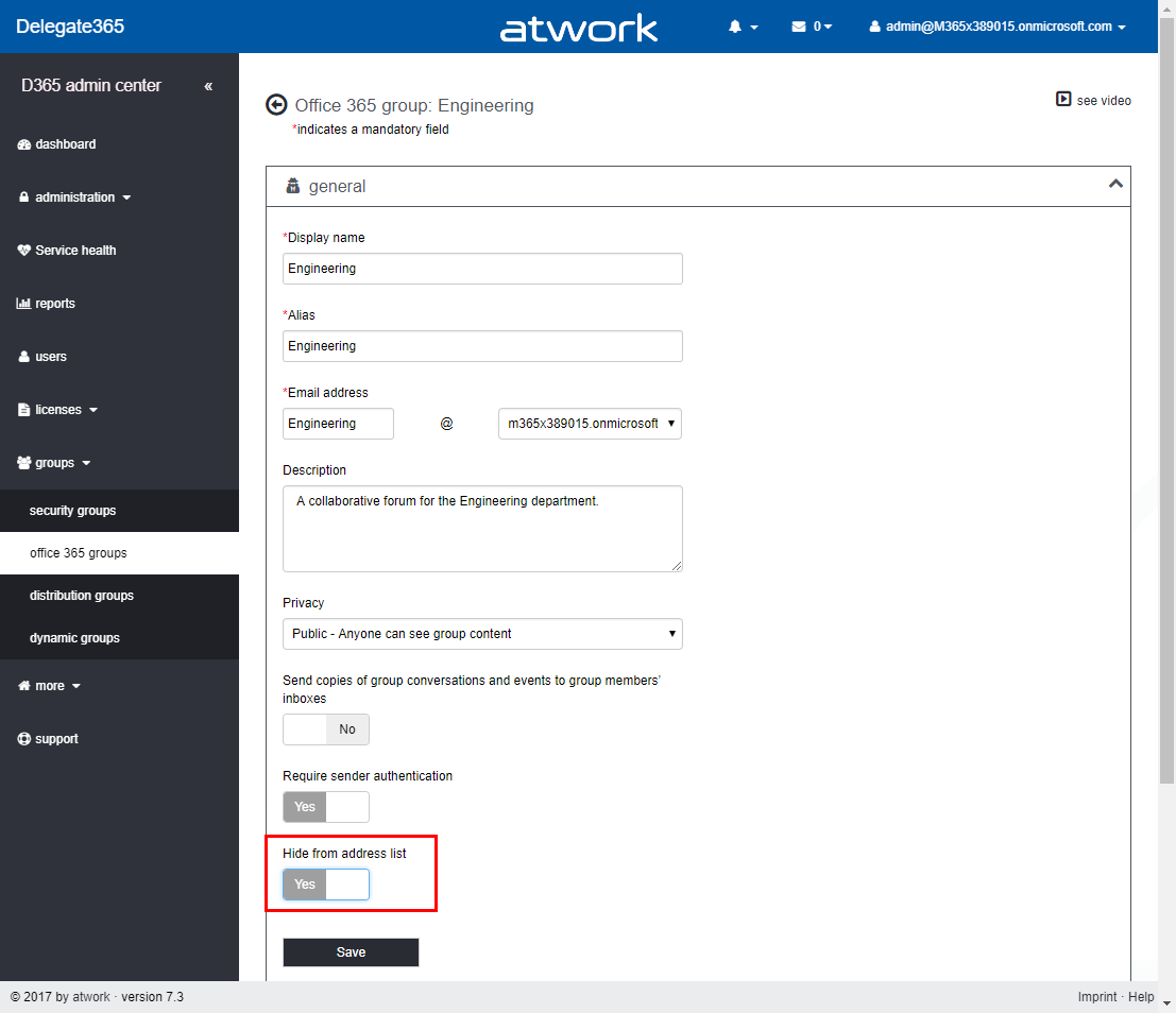By default, Hide from address list is set to No. Use this switch for an Office 365 group if needed.