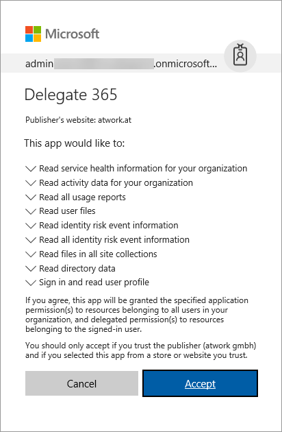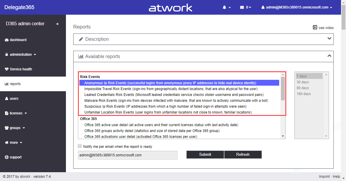 So, after the setup, login with the Global Administrator and accept the new consent for all users in your tenant – otherwise no one can sign-in and use the Delegate365 app.Additional reports “Risk events”: The list of available reports now offers six new reports showing threads to the Office 365 tenants – filtered just for the entitled OU’s of the signed-in administrator.