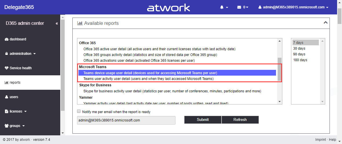 Important: Since the new reports require additional permissions in the Office 365 tenant, a Global Administrator needs to run a new Delegate365 setup once. Please see Delegate365-(Re)run the setup for a step-by-step manual. This step is necessary after the update to Delegate365 v7.4 was done.