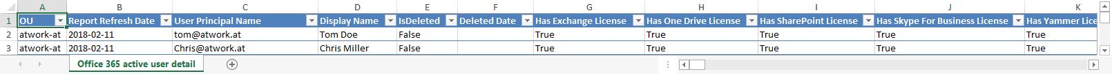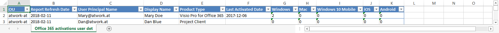 This report delivers activated Office 365 licenses per user. If more information is existing, the license activation date and installed clients are shown.